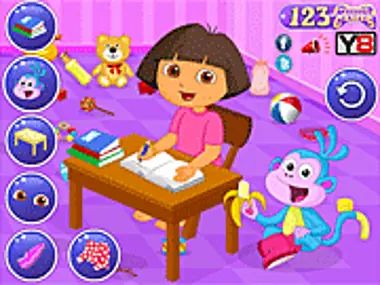 Dora va a jugar a la escuela. Tiene mucho que estudiar. ¿Ayudarás a Dora con sus estudios? Dale los libros que necesita junto con un borrador, lápiz y regla. Puedes darle algunos juguetes para que no se aburra mientras hace su tarea. Cambia el diseño de su mesa de estudio. También cambia su vestido, calzado y color de ojos. Ponle un nuevo fondo para que Dora se sienta feliz haciendo sus estudios. ¡Oye! Ha terminado su tarea y está lista para jugar con sus amigos. Este interesante juego gratuito para chicas te lo presenta DollyGals.