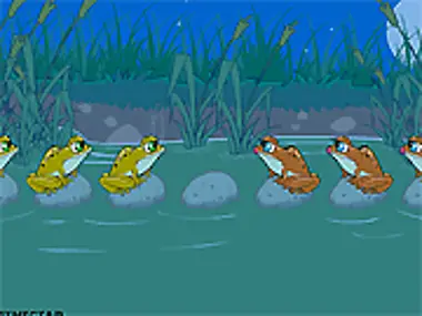 Click on the frogs to jump them over each other and get both groups to the other side.