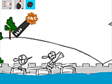Adjust your angle & fire rocks & bombs at the enemies on islands on the opposite side as you.