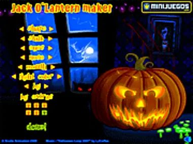 Crea tu propia calabaza de Halloween Jack O' Lantern en cuestión de segundos. Cambia el fondo, la forma de la calabaza, la forma del tallo, añade una nariz de cerdito o aterradora, personaliza la boca y los colores de las luces interiores. El juego ofrece complementos secretos adicionales y detalles espeluznantes, tales como: un cuadro en la pared, cristales rotos, un gato con ojos de diablo, arañas y mucho más. Pulsa el botón "Hecho" cuando termines para echar un mejor vistazo a tu creación artística.