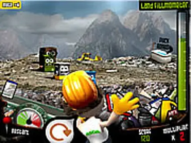 Throw the garbage into the recycling bins that move around the landfill. Be quick!