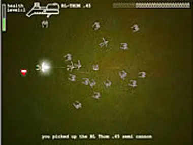 The monsters are surrounding you in this top down view shooter. Shoot the monsters and grab the guns