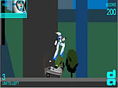 You are a large mech, jumping on your enemies. In later levels you can change into a jet.
