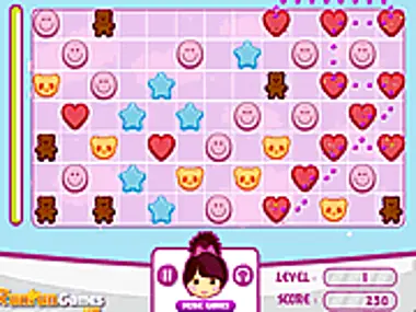 Laura needs to finish this game which is all about connecting stars, bears and hearts. Get them to line up and then form a square to disappear. You win when you have eliminated all of them.