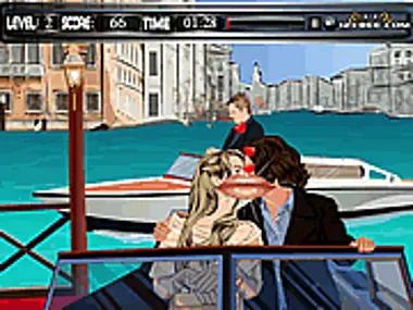 Johnny Depp y Angelina Jolie quieren besarse. Haz que esta pareja exprese su amor haciendo clic con el ratón, sin que el Sr. Paul Bettany los note. Estate atento o te meterás en problemas.