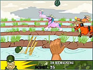Throw the grenades just far enough and lead the unicorns just enough to blow them away.