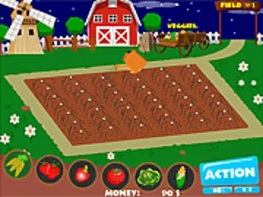 Eres un agricultor exitoso. Tienes 12 campos independientes. Siembras verduras y maíz. Tus verduras: zanahorias, pimientos, tomates, fresas, repollo, maíz. Cavas el bancal con una pala. Siembras verduras y quitas las malas hierbas. No olvides fertilizar y cosechar. En el mercado local vendes verduras.