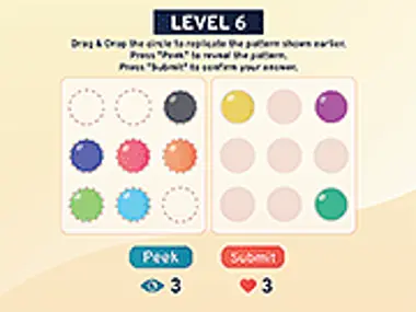 Sumérgete en un emocionante desafío de memoria donde necesitas memorizar patrones y recrearlos arrastrando y soltando círculos. Este juego comienza fácil, permitiéndote familiarizarte con las mecánicas, pero la dificultad aumenta rápidamente, especialmente cuando alcanzas el quinto nivel. Cada ronda presenta un nuevo patrón para recordar, poniendo a prueba tu memoria y atención al detalle. La jugabilidad atractiva y la dificultad creciente lo convierten en una prueba perfecta para tus habilidades cognitivas. ¡Disfruta jugando a este juego de memoria aquí en Y8.com!